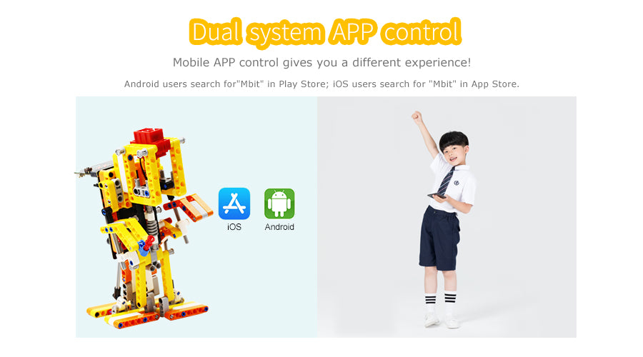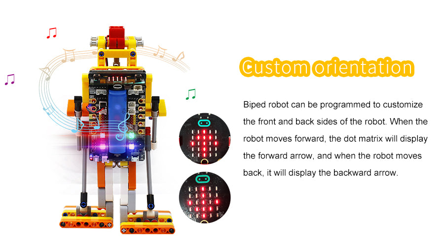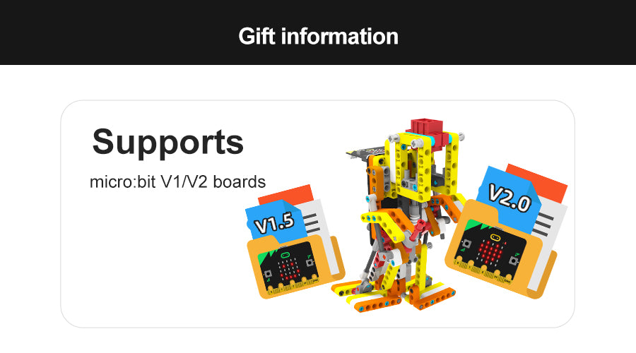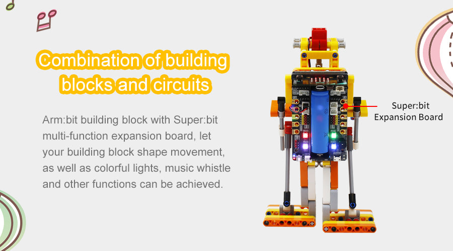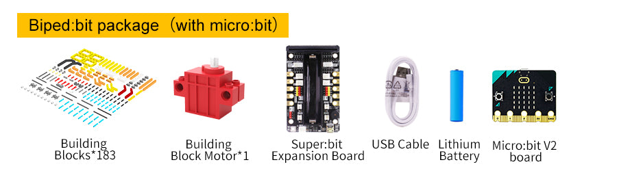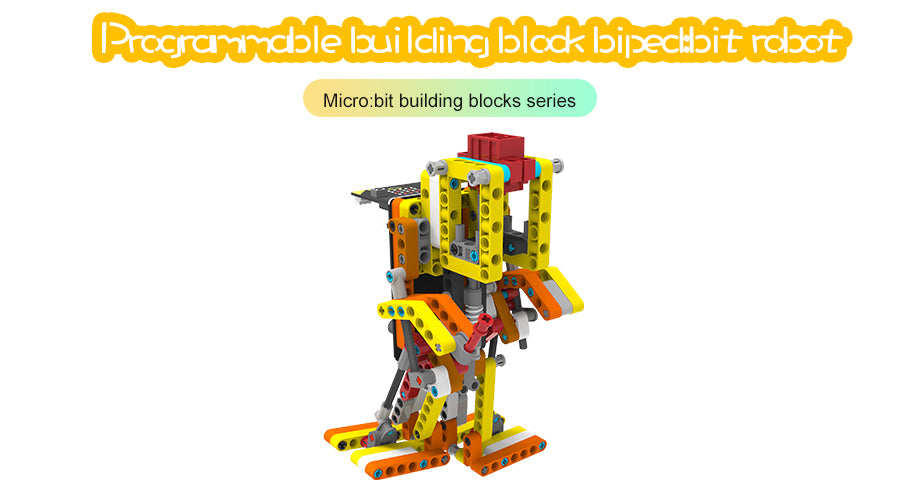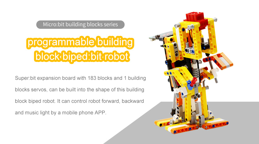 Este Pack contiene 183 bricks de construcción que animan a la creatividad a través de la programación en combinación con la placa de expansión multifuncional Super:bit y los bricks de motores. Con todos los bricks incluidos se puede crear un robot bípedo que puede caminar como un humano, controlar el estado de su movimiento, la música y las luces desde la App móvil para Android e iOS. Personalizable vía programación tanto la pate delantera como la trasera, la dirección de la flecha en la matriz de LEDs dependiendo del estado de ánimo del robot.