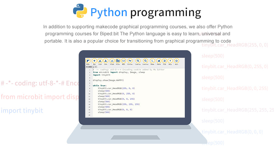 miro:bit admite programación gráfica mediante MakeCode o a través de Python, más adecuada para diferentes edades. El ensamblaje del robot bípedo se detalla paso a paso.